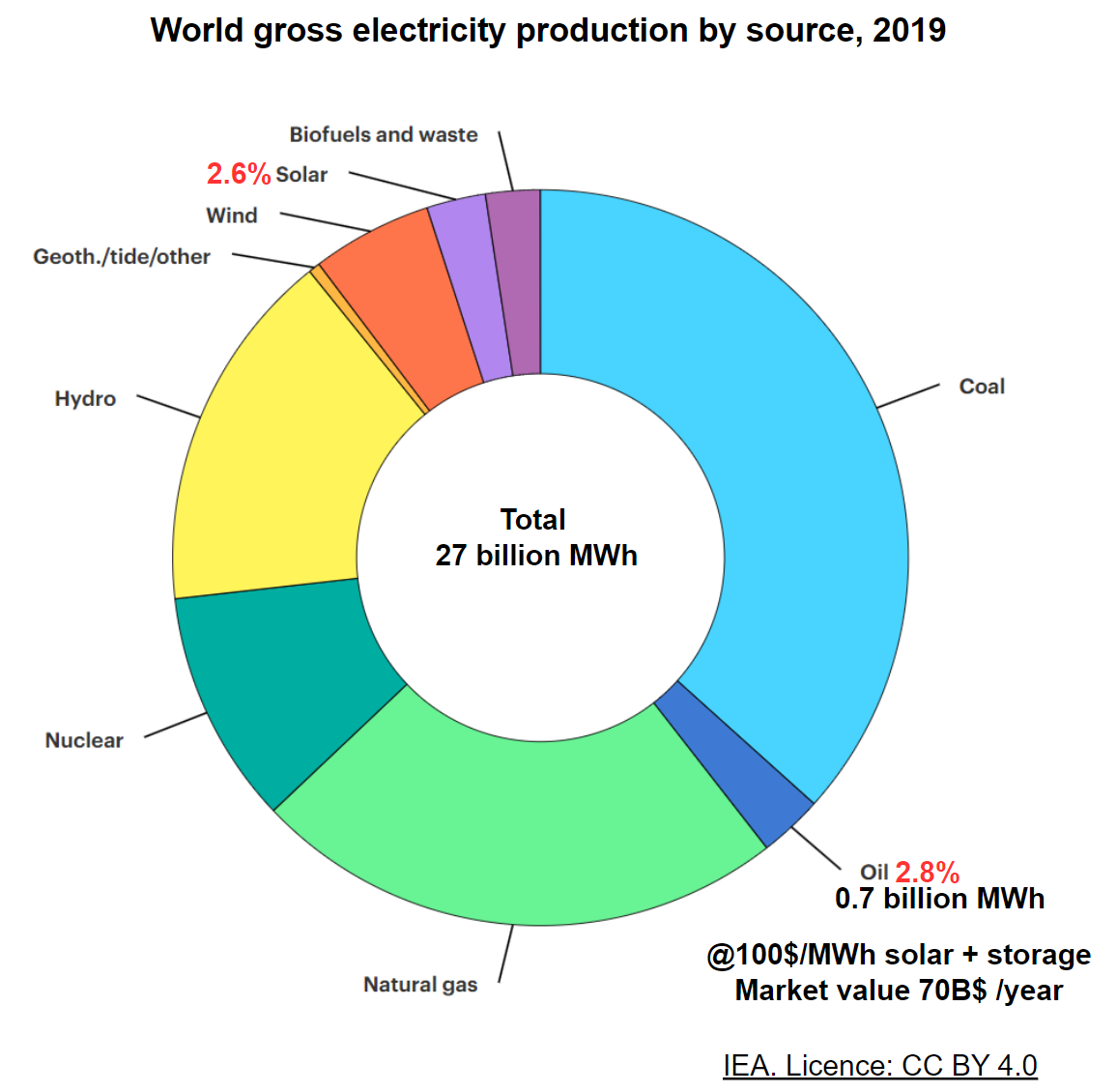Although oil-fired power plants account for less than 3% of global electricity generation, their output quantity is comparable with total solar-generated electricity.