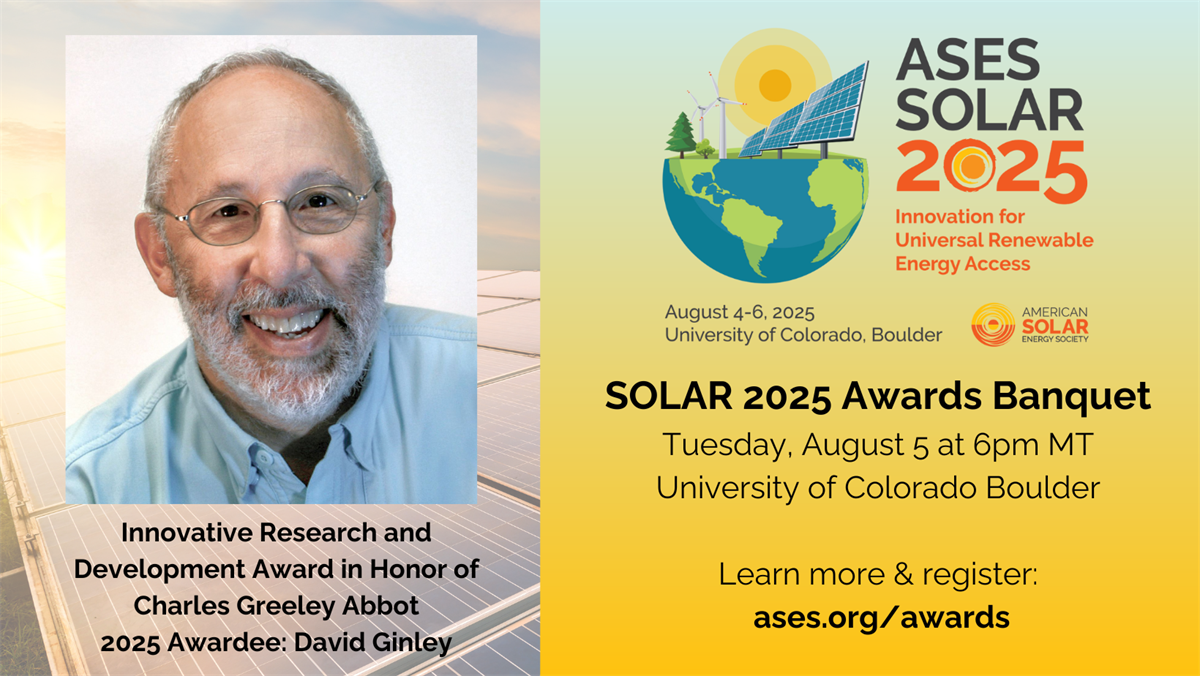 For nearly 50 years, Dr. David S. Ginley has been involved in solar energy development, including leadership of national and international projects. After spending his early career at Sandia National Laboratories, he joined the National Renewable Energy Laboratory. There, he has led the Process Technology and Advanced Concepts Group and currently serves as Chief Scientist for Materials and Chemistry Science and Technology. He is also an NREL Research Fellow. His work focuses on advancing solar and geothermal energy conversion and storage, including the development and use of new materials through the application of advanced computational design methods. Over the course of his career, David has had over 400 publications and 40 patents. He has been involved in advancing organic-based PV technologies, as well as in advancing perovskites for newer PV device structures. In addition, David has contributed to innovations in advanced education and has served as an active volunteer and board member for ASES.