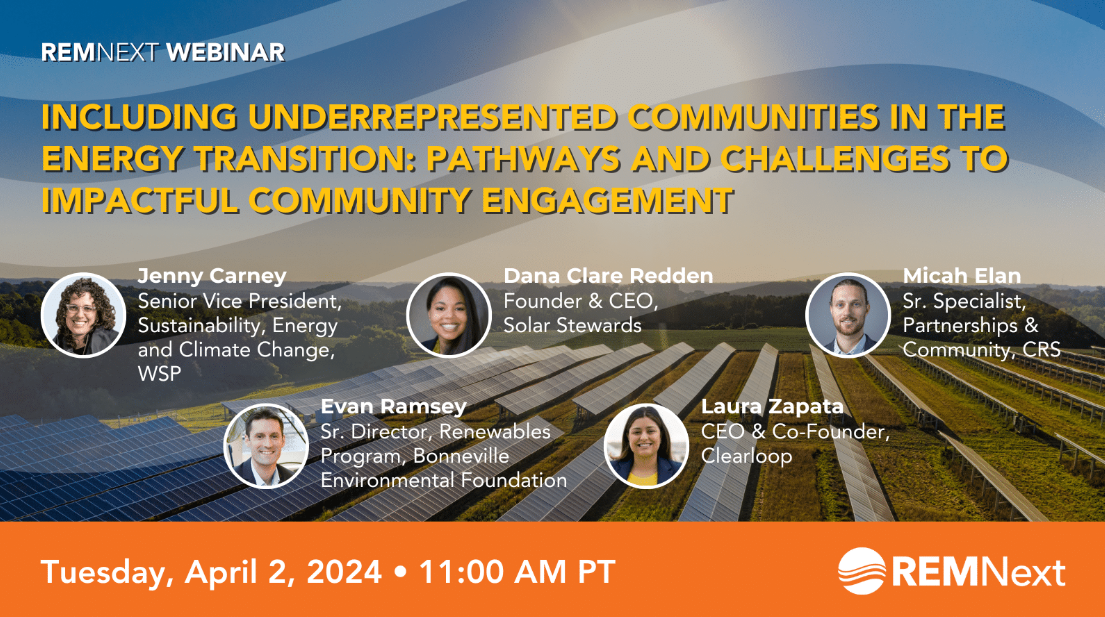 Join our panel of experts, April 2nd at 11:00am Pacific Time, for an insightful conversation on including underrepresented communities in the clean energy transition. During this hour-long webinar, we will discuss the panelists' personal experience and contributions to the field, as well as key examples of renewable energy projects with meaningful community impact. Panelists will highlight essential necessary steps in engaging communities through impactful renewable energy projects, and the challenges associated with securing funding and reporting on successful projects. Discover tangible ways your stakeholder group can contribute to fostering a more just and equitable energy sector.