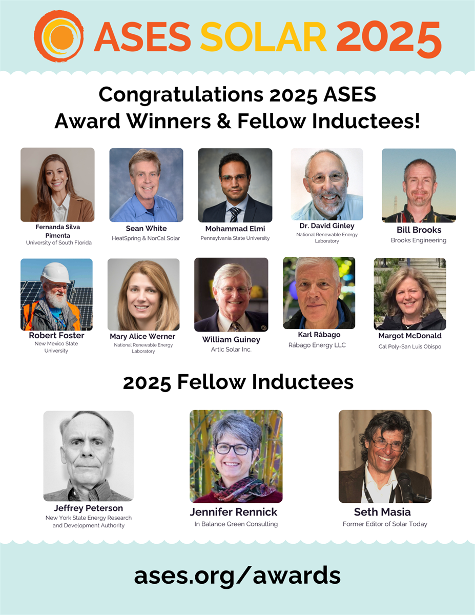"This year, as we mark 50 years of the American Solar Energy Society Awards Program, we have a choice: succumb to the rising threats to our industry, or fully celebrate our 2025 class of awardees and fellows. These individuals embody the spirit of our Society and our movement, which is bold, resilient, and dedicated to making an impact. Given who we are, the latter option is really our only option. I hope this anniversary year is one you will long remember. Let's applaud our new solar heroes and remember that, like the theme song for this party, we are Unstoppable!" Jill Cliburn, ASES Fellow and Awards Committee Chair