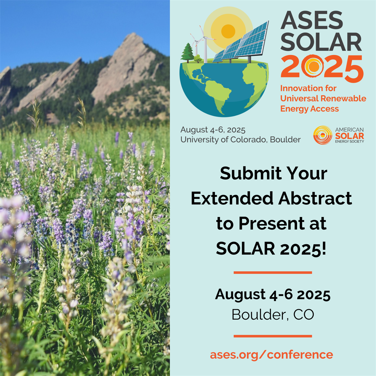 Join us in Boulder, CO, August 4–6, 2025, for the SOLAR 2025 Conference: Innovation for Universal Renewable Energy Access. Submit an extended abstract to present your work on solar tech, energy storage, workforce development, community energy, and more.