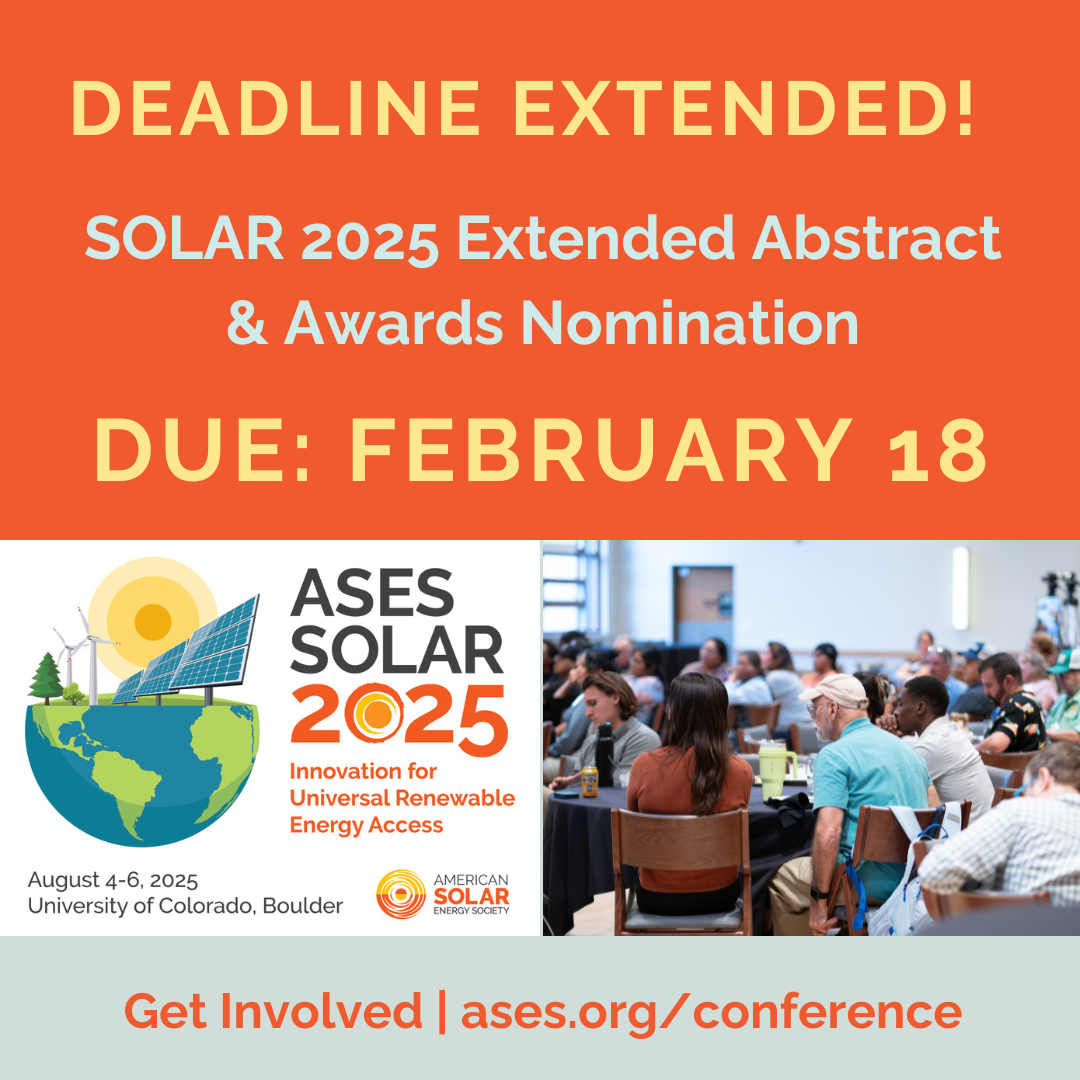 We're thrilled to announce that the deadlines for the Call for Participation and Awards Nominations for SOLAR 2025: Innovation for Universal Renewable Energy Access have been extended to February 18, 2025!