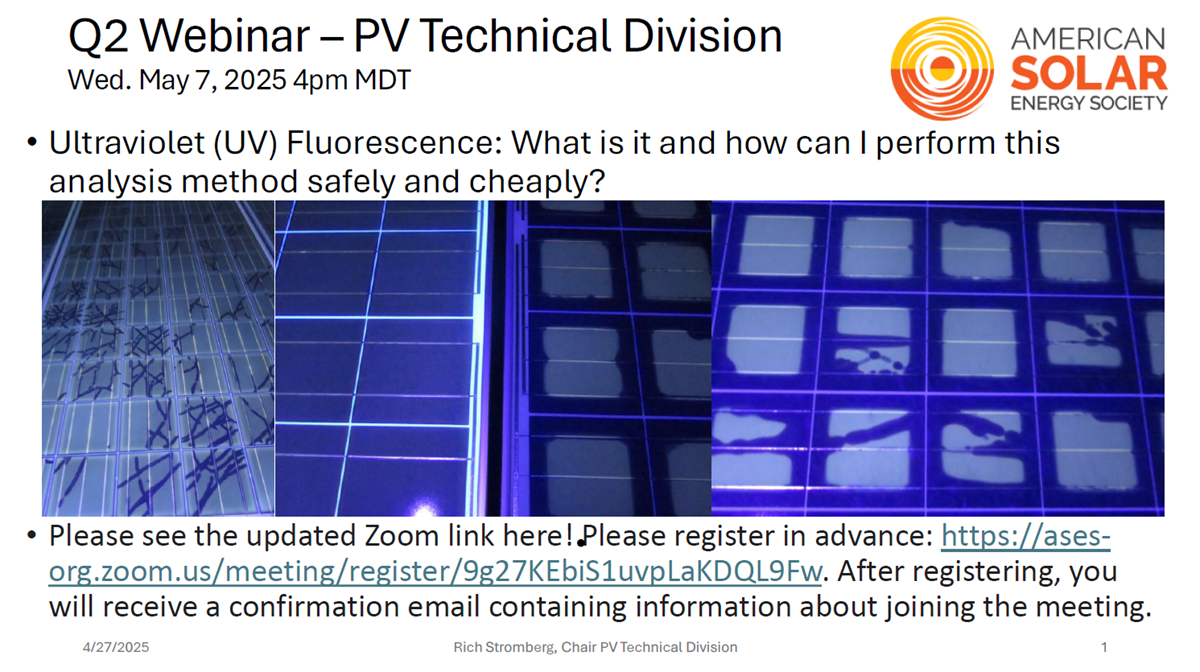 All ASES members are invited to attend a webinar on UV Fluorescence of solar PV modules.