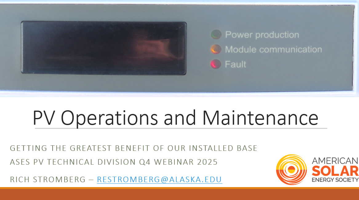 All solar folks are invited to tomorrow's ASES Q3 Webinar on PV Array Operations and Maintenance. Now more than ever, proper and effective O&M practices are key to getting the most benefit out of our installed base of PV arrays. Wednesday, Nov. 5 4-5pm MST.