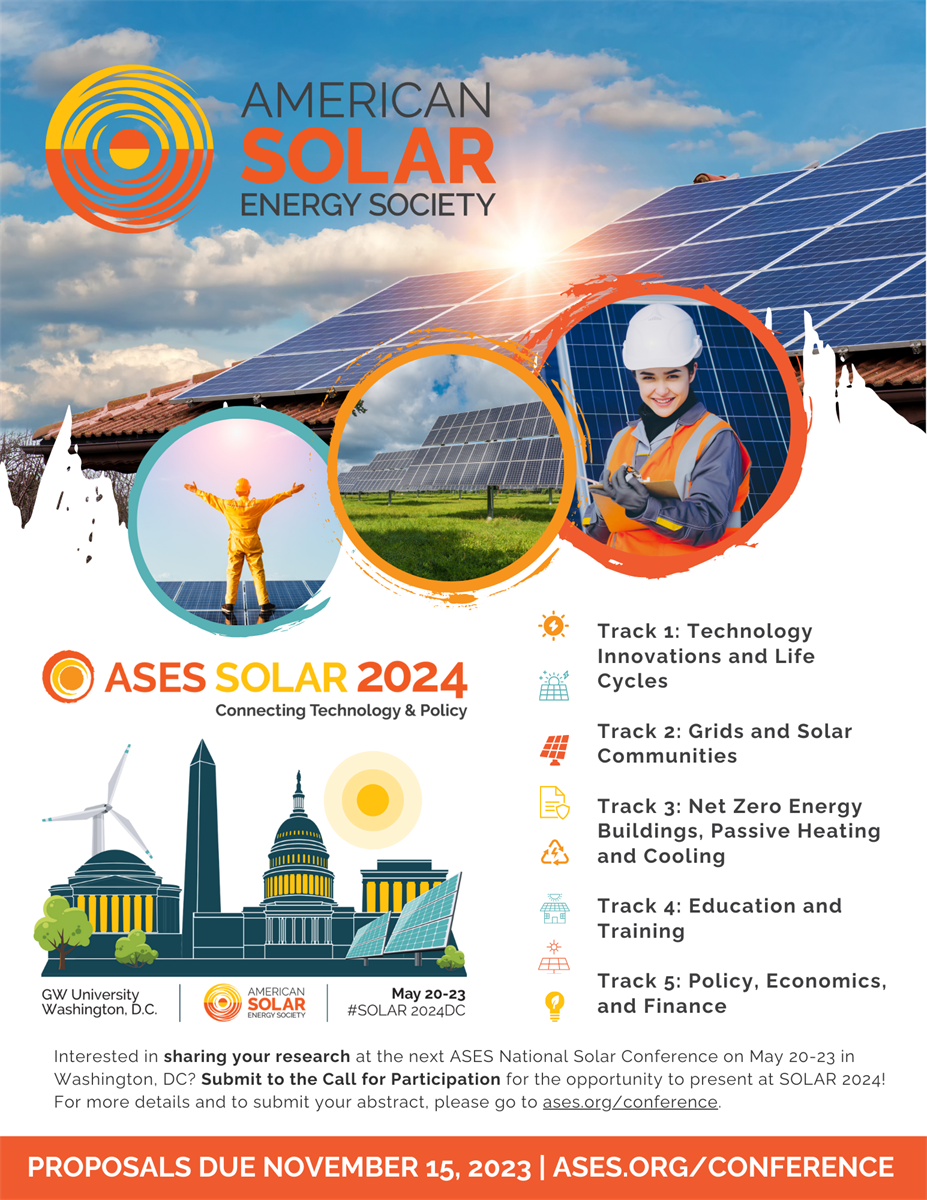 The ASES 53rd Annual Solar Conference is on May 20-23, 2024, in Washington, DC. The theme, Connecting Technology & Policy, will showcase emerging trends, technology, and opportunities shaping the new energy economy.