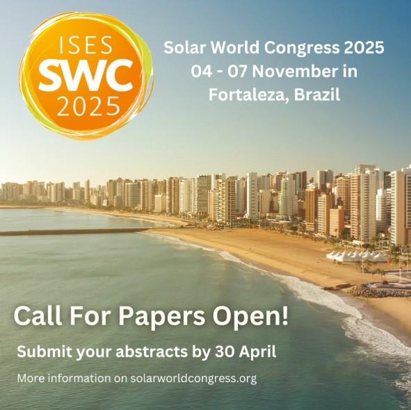 The International Solar Energy Society ISES and the Brazilian Solar Energy Association ABENS, the official ISES section in Brazil, are calling for papers for the Solar World Congress 2025 #SWC2025, taking place from 04 - 07 November 2025 in Fortaleza, Brazil.