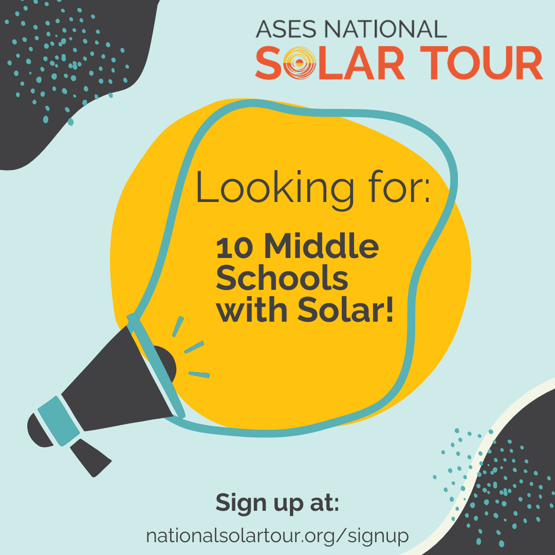 ASES is looking for ten Middle Schools to join the ASES National Solar Tour this October 6-8, 2023! Do you know any schools that would like to join and sign up? Check out more details below!