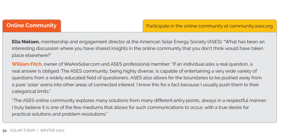 We are looking to highlight an ASES member's testimonail about the ASES Online Community to be shared in the March 2024 issue. If you are interested, please reply in this thread to the following question below. Your quote can be up to 100 words long.