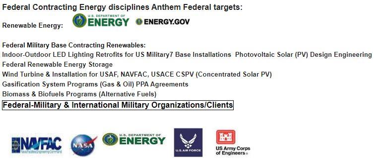 Technically acceptable expertise and value engineering competencies. Questions many ask on developing your Federal Footprint in Federal Contracting: 1. How do I attain my first contract? And how much does self-performance play into this? 2. How do I develop indepth strategic Team Partnering relationships with many of the large Federal prime IDIQ Energy contract recipients who are already on base energy contractors? 3. How can I develop a "Joint" Capabilities Presentation with contracting officers/primes? 4. In speaking with contracting officers at conferences, how do I avoid giving them the "Elevator" speech and what should I say to attain a brief Capabilities Presentation? 5. In teaming with a large prime for upcoming IDIQ** firms as a Small Business how do I negotiate a Team-Partnering of JV alignment that not only makes sense both the prime and the SB subcontractor, but also to the Source Selection Committee? ** Indefinite Delivery-Indefinite Quantity Contract In developing your federal energy footprint your first initial step should be to perform due diligence on your potential teaming partners and ascertain and identify prime IDIQ contractors who are on each military installation you target. Self-performing your firm's core competencies and services is one of the most sought after "bullets" that will draw prime contractors in your direction. Team-Partnering is one of the most important steps: Teaming with the "right" primes as well as subcontractors in energy is extremely important. Your selection should include an extensive due diligence on your prime team partners experience, past performance evaluations, and regarding your chosen sub-contractors primary core competencies, "How much they can self-perform". Anthem Federal Energy focus's developing Federal Business Development programs in the following Renewable Energy Disciplines: Solar Photovoltaic (PV) Design Engineering Federal Renewable Energy Wind Farm Design Engineering Wind Turbine & Installation for USAF, NAVFAC, USACE, CA Dept. of Conservation & approx. 23 additional Federal agencies CSPV (Concentrated Solar PV) Grid Systems Thermal & Waste to Energy Gasification System Programs Biomass & Bio-Fuels Programs (Alternative Fuels) Fossil Fuel Alternatives in Renewable Energy Lighting & LED Applications & Mfg. for Military Base Installations